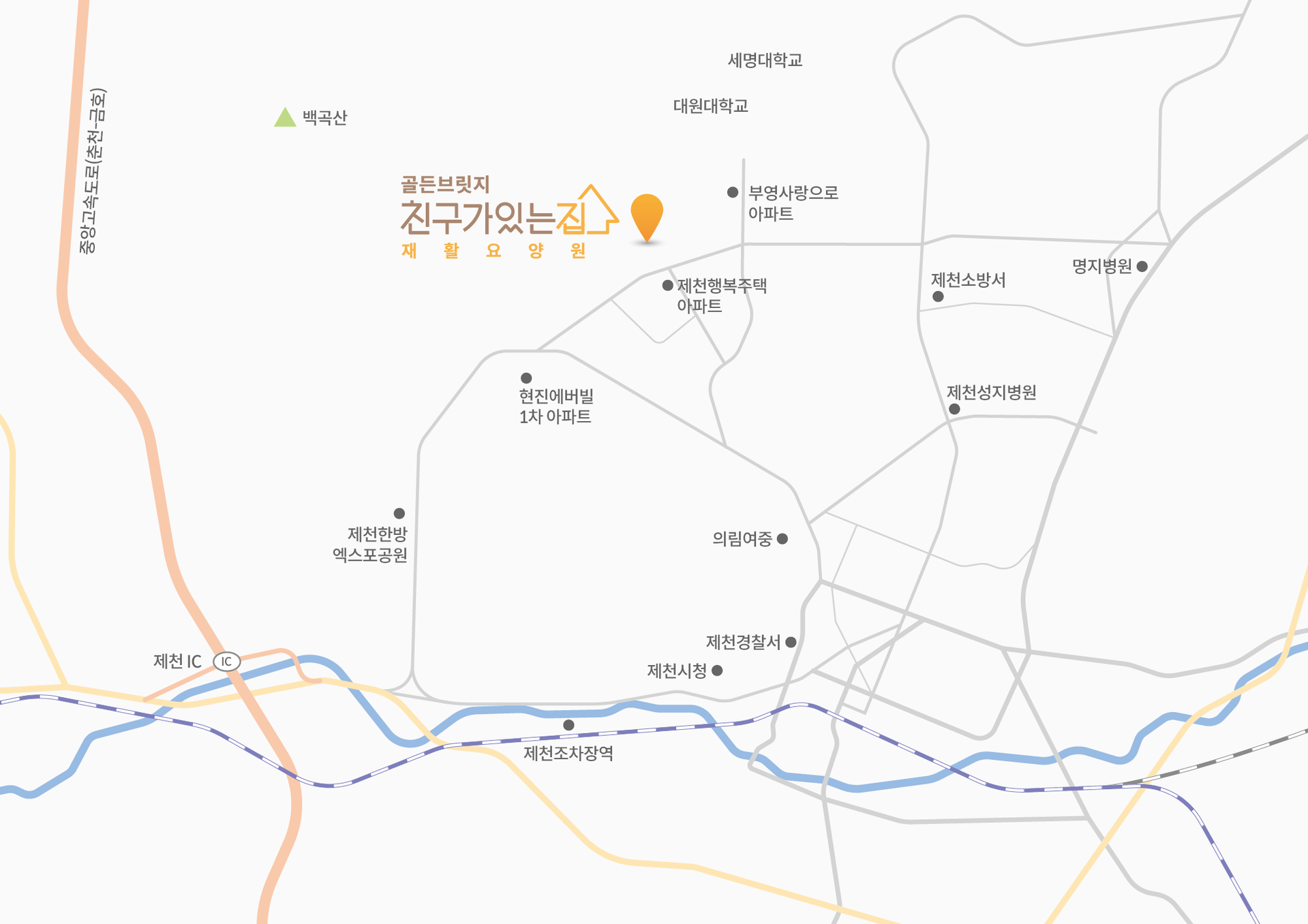 •고속도로 : 제천IC → (신월동 행복주택 신호등 좌회전) → 골든브릿지 친구가있는집 재활요양원 (제천 IC에서 10분 거리)